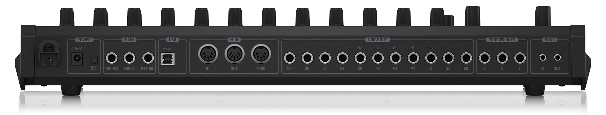 MIDI In/Out/Thruを完備し、USB端子による外部デバイスとの同期・接続にも対応。