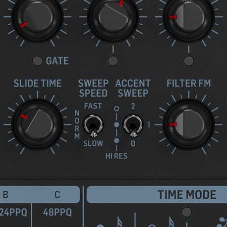 TD-3-MO サウンドの中核を担うのは、24dB/oct のローパス・フィルターです。カットオフ周波数とレゾナンスを自在に調整することで、音色に劇的な変化を与え、理想のサウンドへと追い込むことができます。