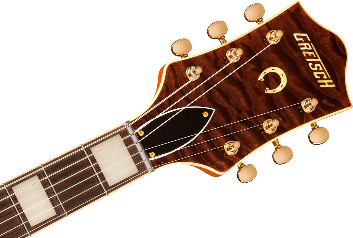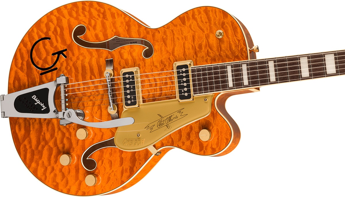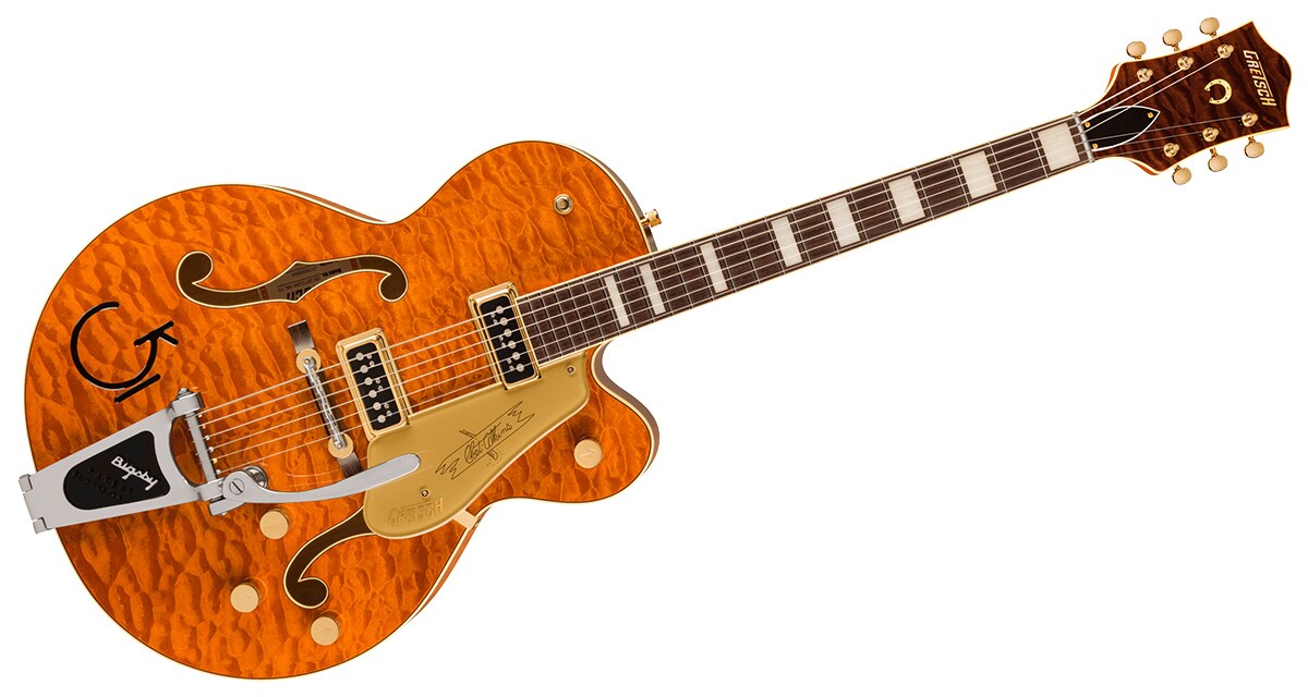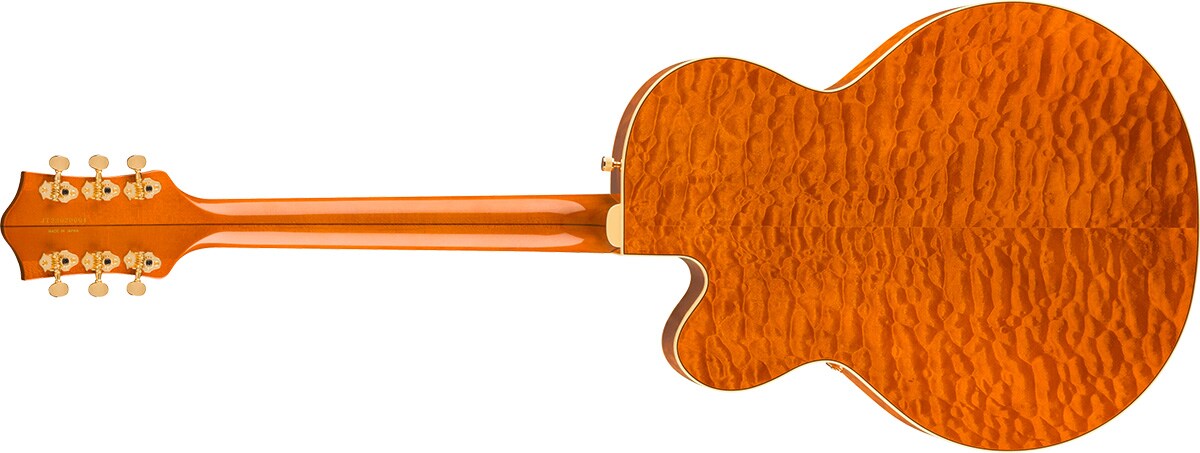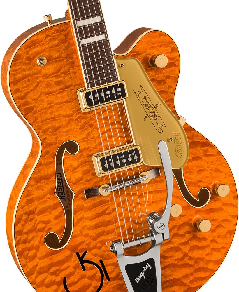 ギタリストが憧れとするギタリスト、チェット・アトキンスとの共同設計による6120モデルは、グレッチの中でも最も広くそのサウンドが聴かれているギターです。G6120TGQM-56 Limited Edition Quilt Classic Hollow Bodyは、初期のデザインを忠実に再現しつつ、エレガントなフィギュアドキルトメイプルをキャッピングすることでクラシックな美学をさらに高めました。オーセンティックなグレッチトーンを提供するこのホロウボディギターは、弾きやすく快適な演奏性を備え、グレッチならではの最高のサウンド(That Great Gretsch Sound!)を誇らしげに鳴り響かせます。
