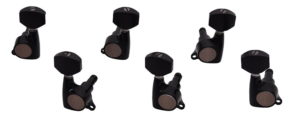 GOTOH製、ペグ配列3対3のギター用ロックペグ。弦のテンションを利用してロックがかかるマグナムロック仕様、EN07ボタン、カラー:ブラック。