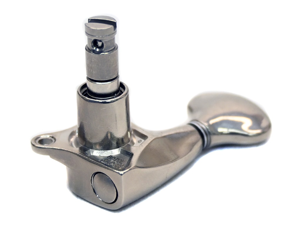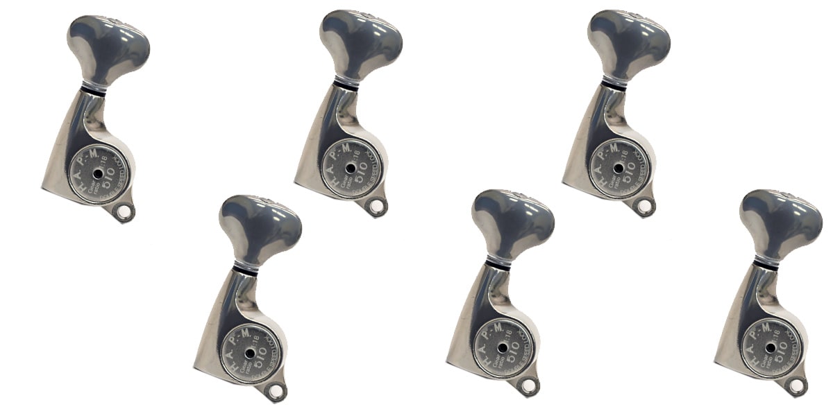 GOTOH製、ペグ配列L6連(シャフトしてあり特注仕様)のギター用ロックペグ。HAPとMG機構がひとつになったハイトアジャスタブル・マグナムロック仕様、S5ボタン、カラー:エクセレントニッケル。