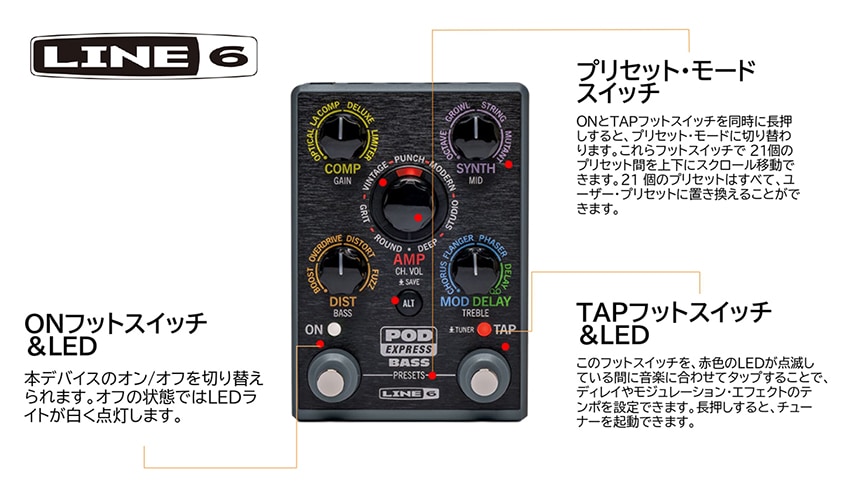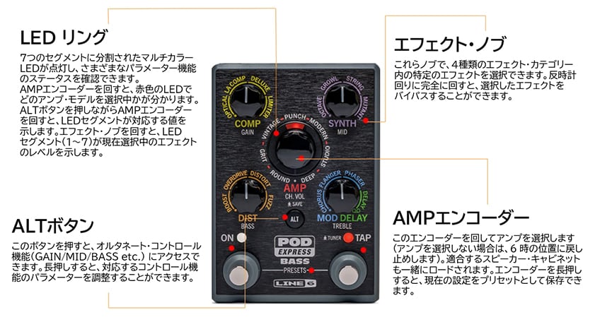 POD Express Editアプリで細かい調整が可能なので、楽曲に合わせてじっくりと音色を作り込めます。ノブを回したときに光るLEDも、視認性が高くルックスもクールです。