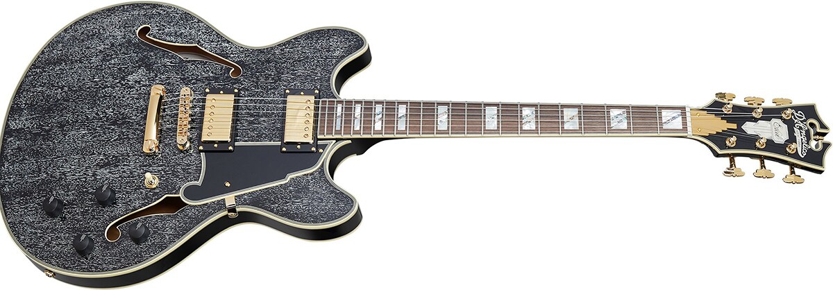 ディアンジェリコらしさを感じるオリジナル形状のピックガードは、fホールの一部を思わせるデザインで、ブラック(5プライ)となっています。