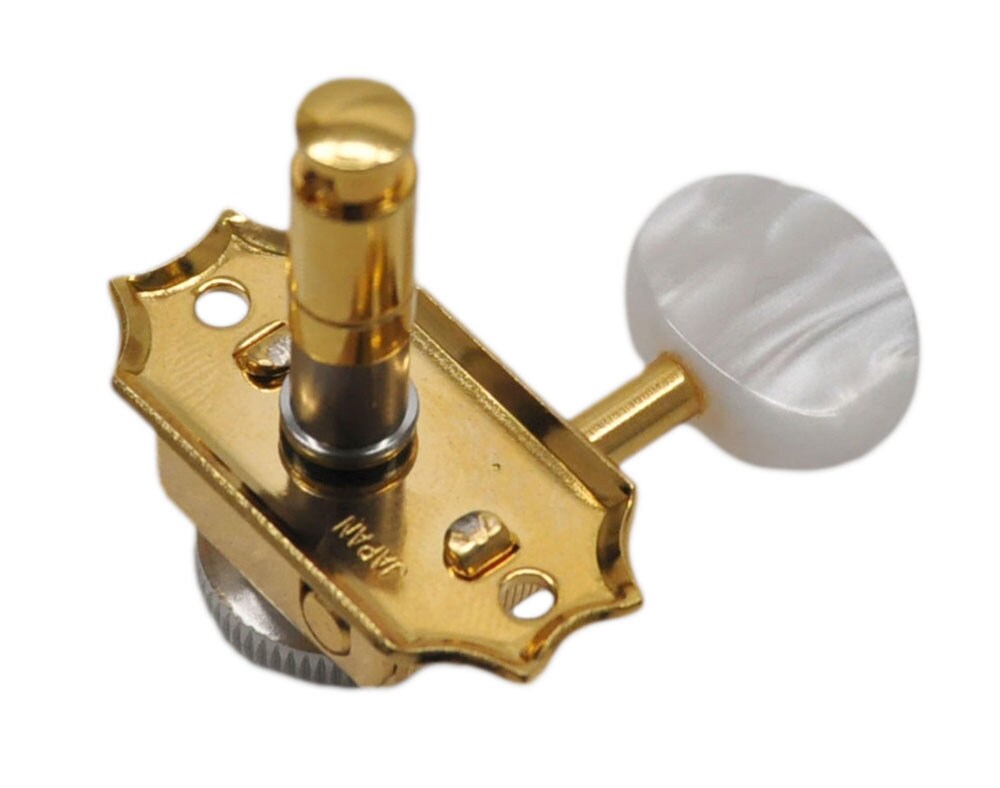 GOTOH製、ペグ配列L4+R2のギター用ロックペグ。ダイヤル付きフィンガーロックタイプのマグナムロックトラッド仕様、P5Wボタン、カラー:ゴールド。