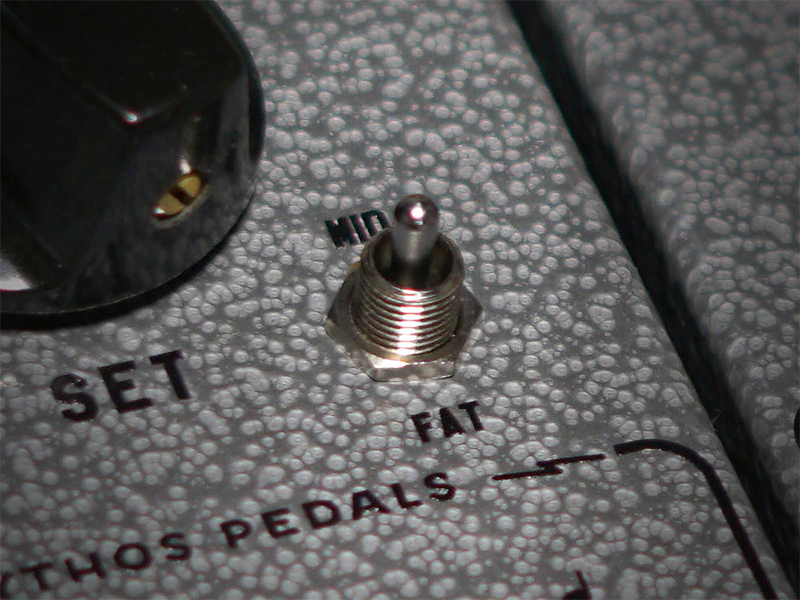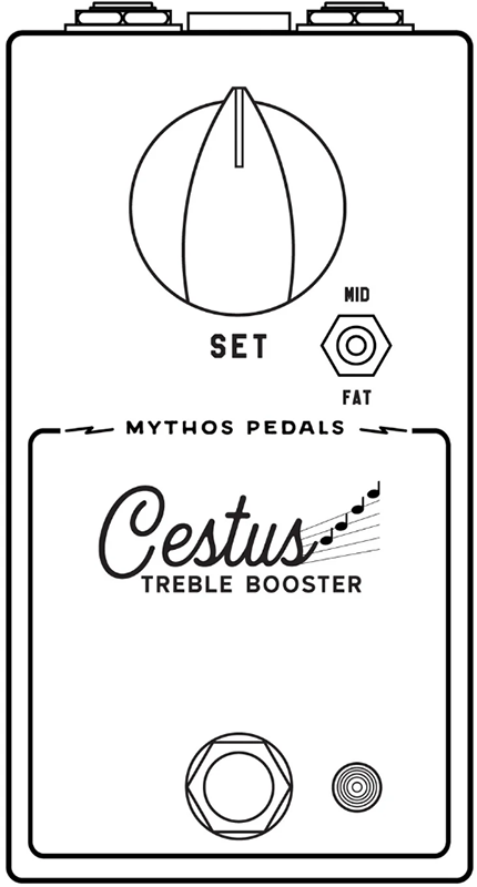 Cestusの前面にあるスイッチは3ウェイ・ボイス・トグルです。これにより、classic/thinブースト・トーンから、中音域が前面に出たトーン、そして低音域が強いトーンまで、トーンを変えることができます。この便利なトグルにより、セットアップに合わせてボイシングを調整したり、より幅広いトーンをカバーしたりできます。 Cestusの後に適切なアンプまたはダート・ペダルを使用すれば、リード・トーンとリズム・トーンの全域をカバーできます。 SETコントロールは、全体的な出力を設定します。出力範囲が広いため、信号のわずかな再ボイシングから、 ディム時のアンプの破壊力まで、さまざまな設定が可能です。アートワークは、このユニットのインスピレーシ ョンとなったオリジナルのアンプ・トップ・ボックスにインスパイアされています。
