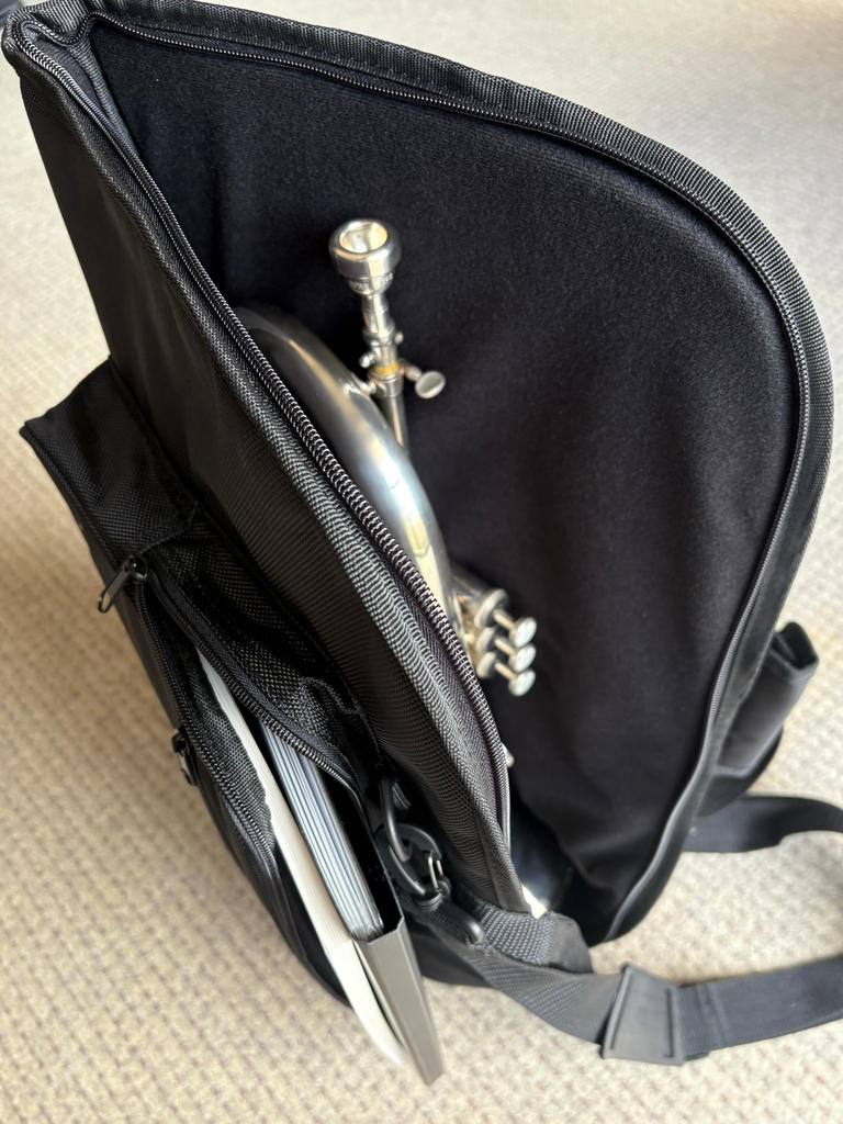 PTCFHに比べて大きさに余裕があり、写真のようにマッピを付けたまま入れることも可能です(衝撃を受けた際のこと考えるとオススメはしませんが)。底面部接地用のクッションが四つあり(商品写真だと右側面に二つ見えるコブがそれ)、ベルを下にした状態で自立しますが余り安定性はなく、楽譜等を入れると容易に重心が変化するので、自立放置はオススメできません。