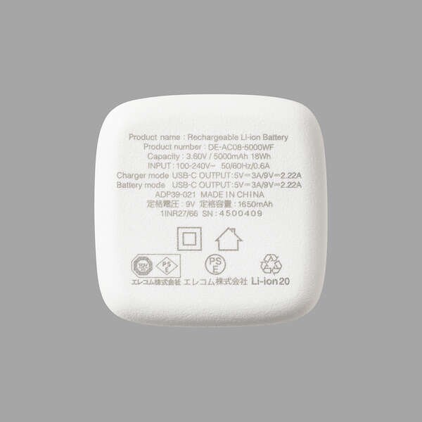 ■定格出力電流:最大出力20W AC充電器として使用時・バッテリーとして使用時いずれも3A/2.22A