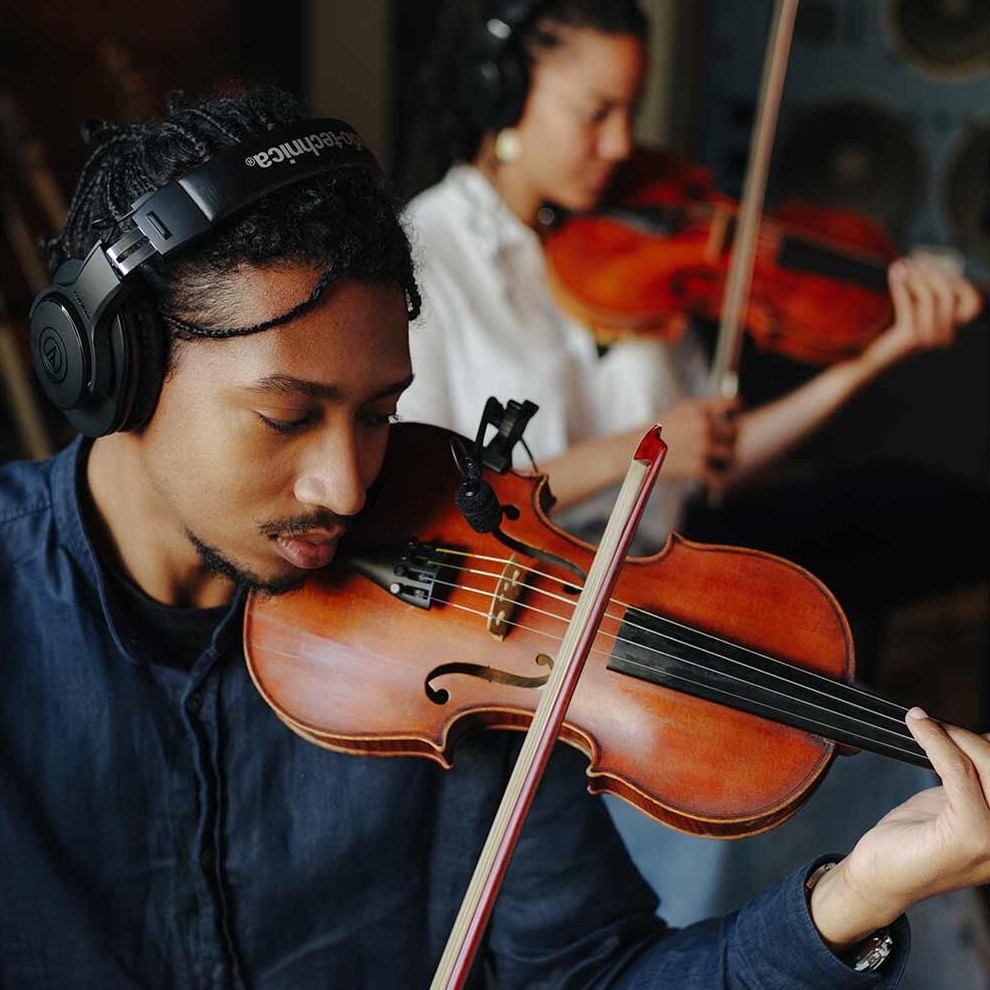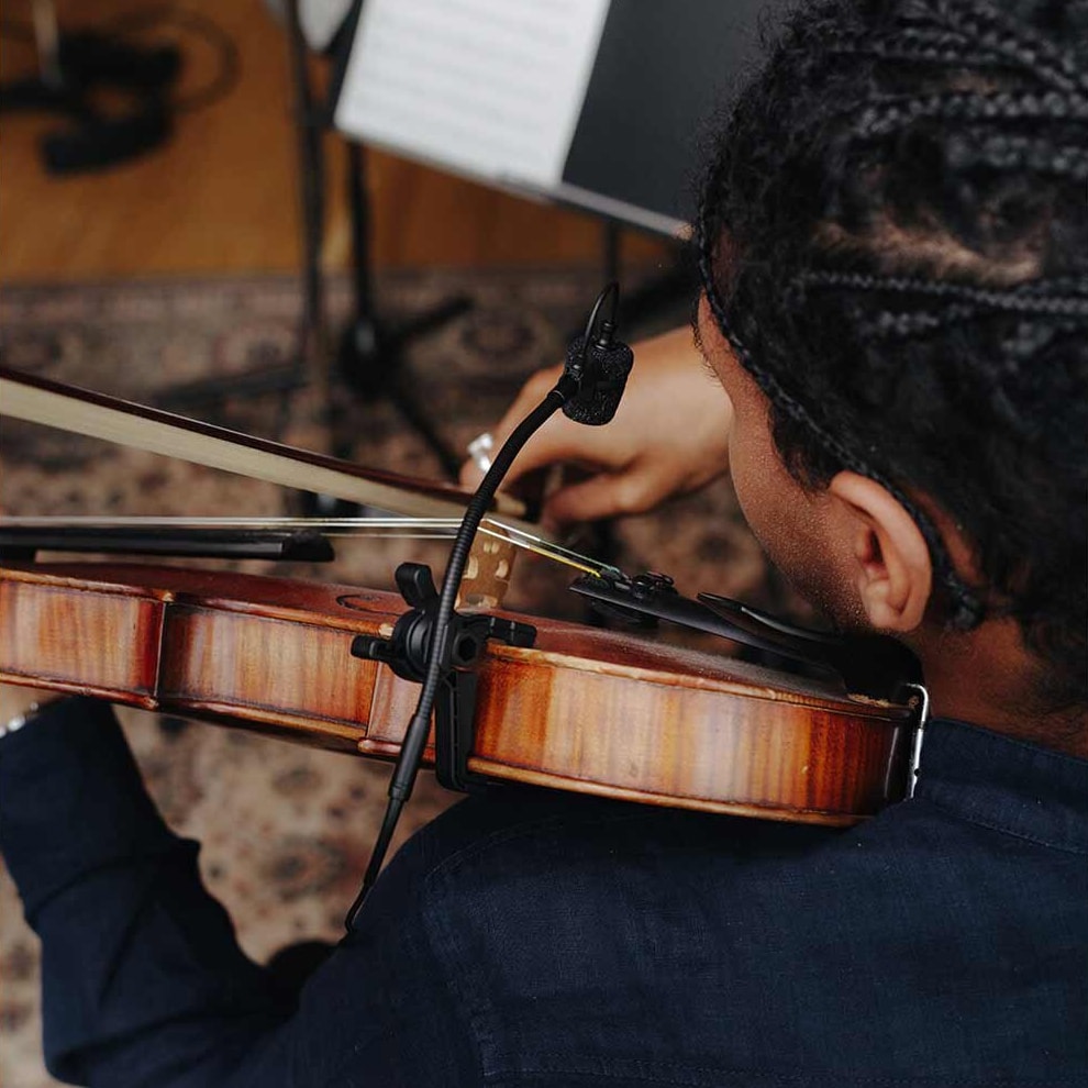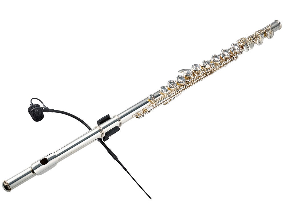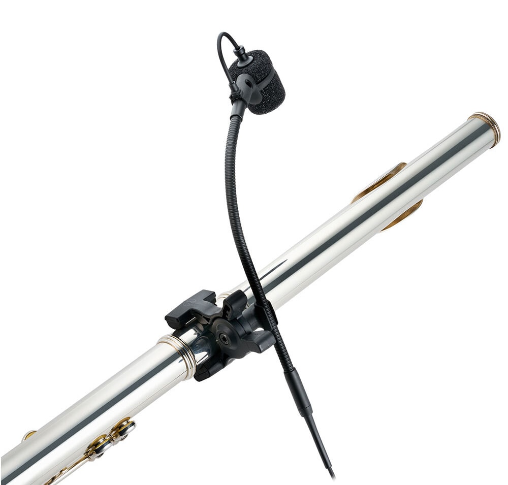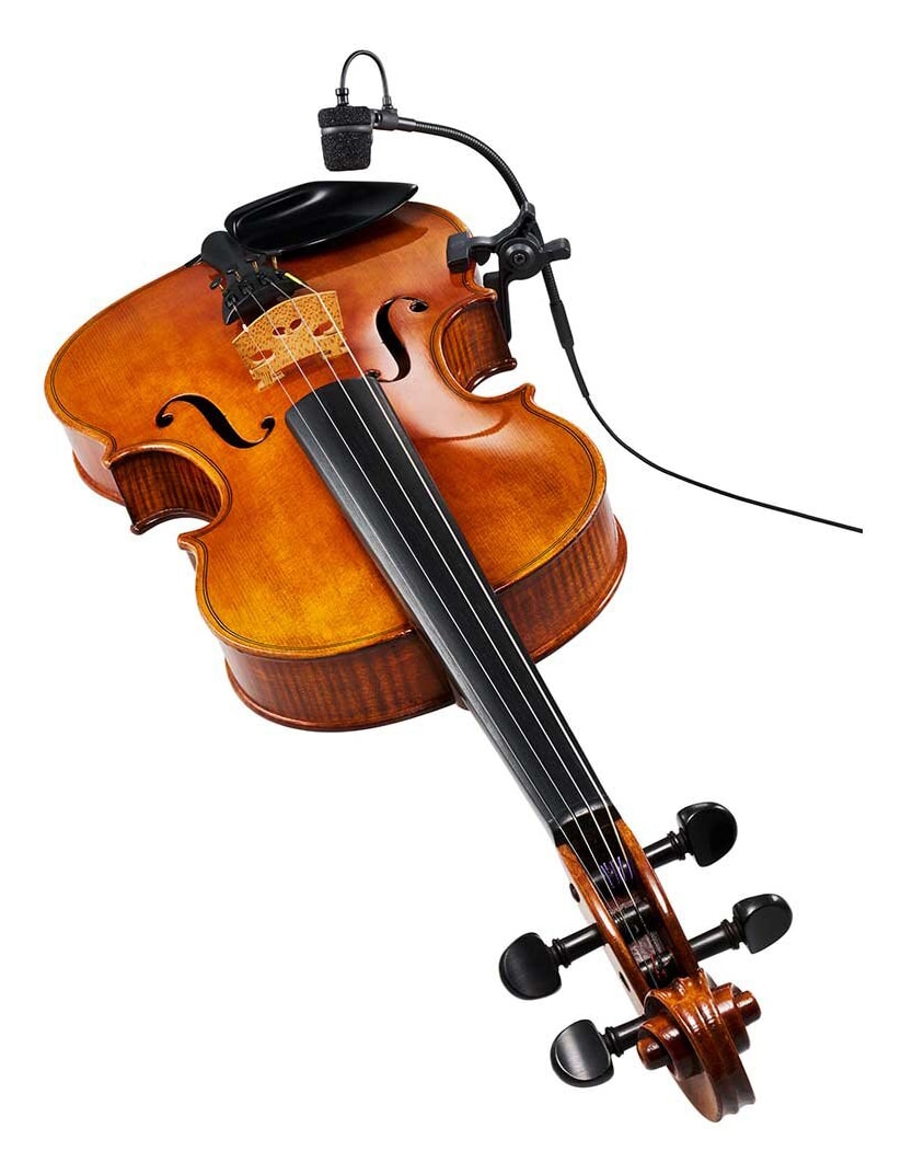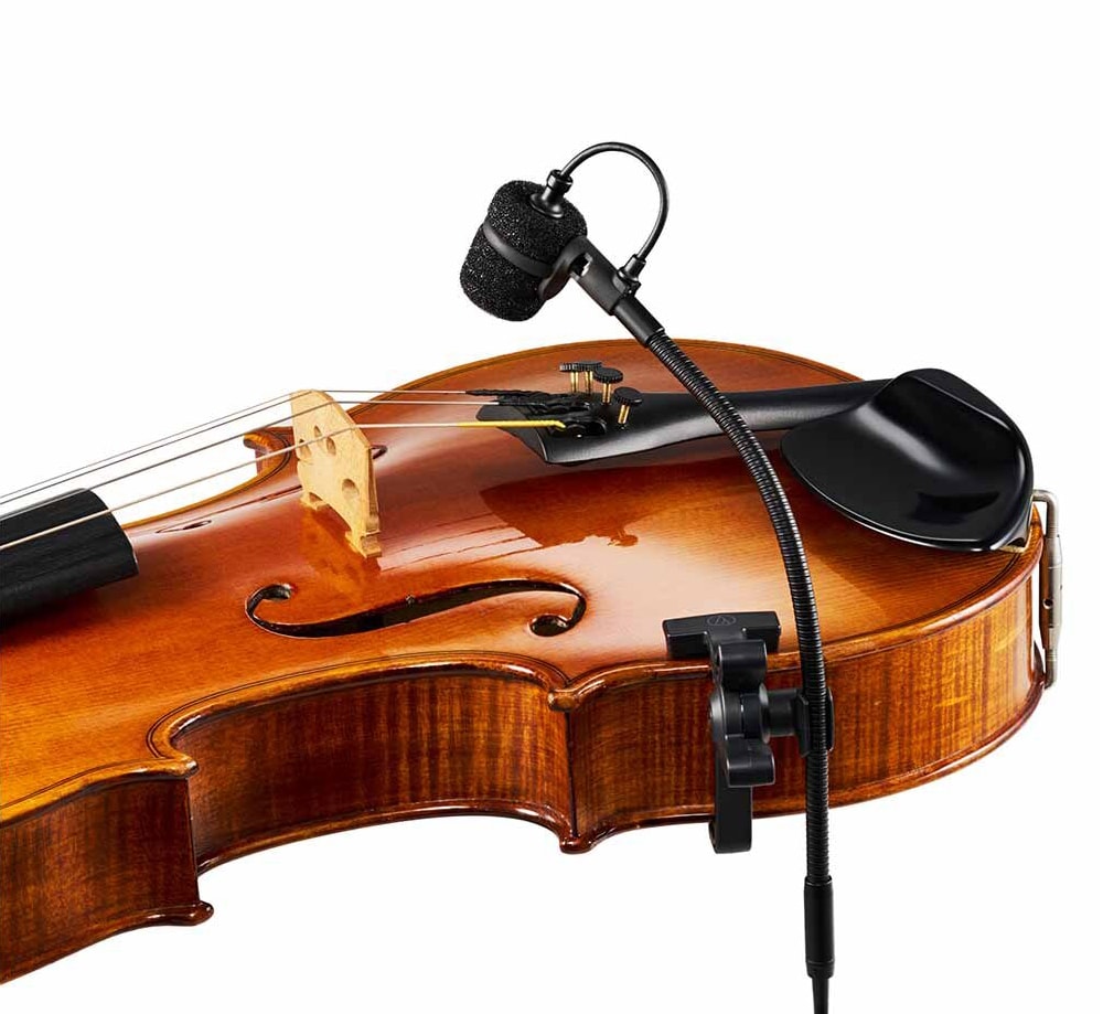 バイオリン、ヴィオラ、フルートなどの楽器に装着可能な小型コンデンサーマイクロホン