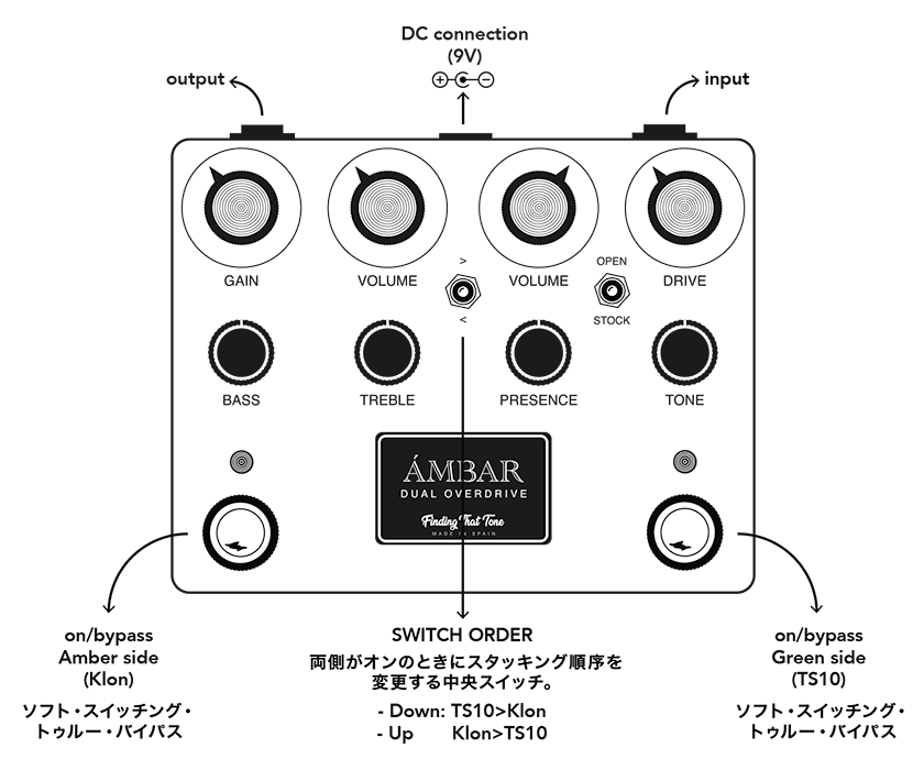 ÁMBAR – Dual Overdrive は、伝説的な Klon と TS10 回路をベースに設計されています。オリジナルの魅力を損なうことなく、より幅広いトーンと高い汎用性を実現するために主要な部分を再設計しました。さらに、TS10 → Klon または Klon → TS10 の順番で自由にスタック可能。ペダルボードに収まりやすいコンパクトサイズに、多彩なサウンドを詰め込みました。もちろん、誰もが愛してやまない“あの”アイコニックなサウンドも、この1台で手に入れることができます。