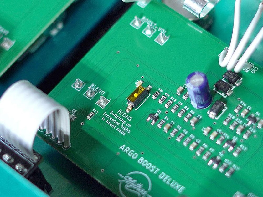 Argo Boost Deluxeには、音にきらめきを加える HIGHSスイッチ を搭載。Mick Taylorのアイデアから生まれた機能で、ブースト音を少し明るめに仕上げられます。初期設定はOFFですが、ONにすると高域に繊細なスパークルが加わり、サウンドに彩りをプラス。ただし、この明るい回路はオクターブファズには影響しません。