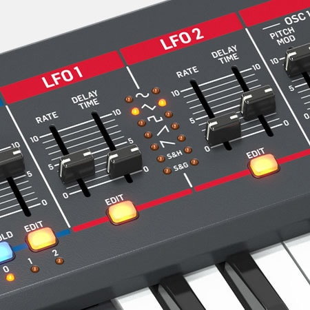 各ボイスに搭載された2基のLFOは、オーディオレートまで拡張可能。スルーレート調整、モジュレーションディレイ、キーシンク、クロックシンク(内部/外部MIDI対応)、エンベロープ自動トリガーなど、柔軟な制御が行えます。波形はサイン、トライアングル、スクエア、ランプアップ、ランプダウン、サンプル&ホールド、サンプル&グライドの7種類を選択可能。さらにポリLFOの位相リンク機能により、全ボイスをユニゾンまたは可変フェーズシフトで動作させ、動きのある音像を生み出します。