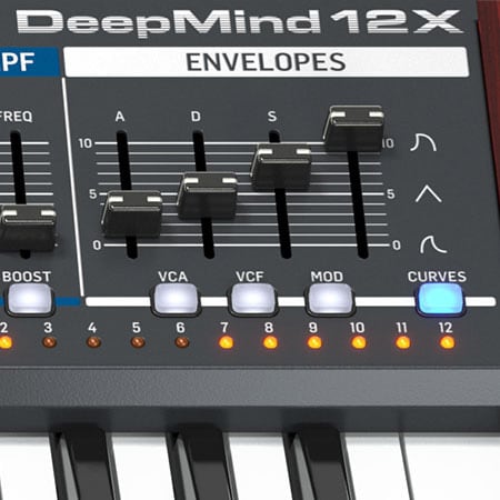 DEEPMIND 12X は1ボイスあたり3基のADSRエンベロープを搭載し、各セグメントをリニア/エクスポネンシャル/逆エクスポネンシャルカーブに連続可変可能。レガート、モノ、リトリガーなどのトリガーモードに対応し、キー入力やLFO、シーケンサーによるトリガーも可能です。ループ動作にも対応しており、リズミカルなモジュレーションや複雑な時間変化を自在にプログラムできます。