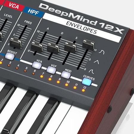 DEEPMIND 12X は、26本のスライダー、33個のスイッチ、1基のロータリーエンコーダー、2つのノブ、さらにスプリング式ピッチホイールとアサイン可能なモジュレーションホイールを搭載。洗練されたレイアウトにより、すべての操作系へ素早くアクセスでき、快適かつ直感的なサウンドメイキングを実現します。