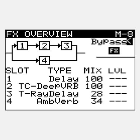 FX ボタンを押すと、LCD 画面に FX メニューが表示され、エフェクトのアサイン、ルーティング、Mode/Mix/Level などの操作が行えます。「Bypass Mode」を選択すれば、デジタルFXを完全に信号経路から排除し、ピュアで高忠実度なアナログトーンを出力。アナログ本来の質感をそのまま楽しむことができます。