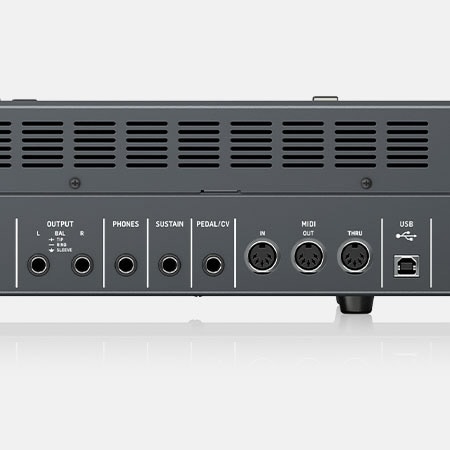 DEEPMIND 12X は、サーボバランス対応ステレオTRS出力をはじめ、ヘッドホン端子、サステイン端子、ペダル/CV入力、MIDI(IN/OUT/THRU)、USB-MIDI など豊富な端子を装備。外部デバイスやDAW、コンピューターとの連携をスムーズに行えます。また、MIDI は非常に幅広い実装を備えており、ほぼすべてのパラメータを NRPN/CC で詳細にコントロール可能。バルクロード/セーブにも対応し、柔軟なワークフローを構築できます。