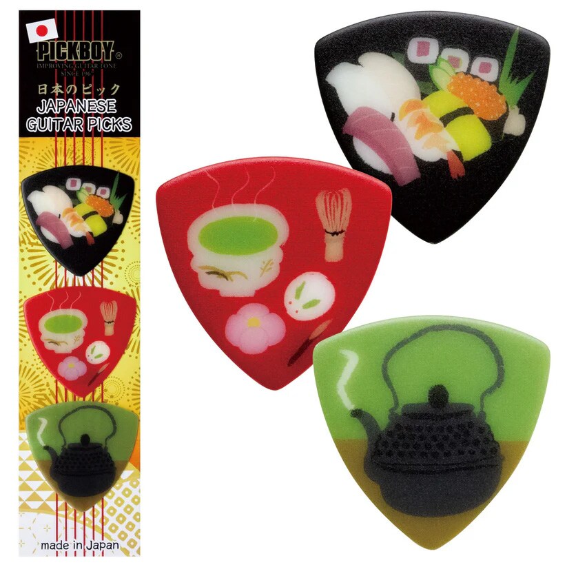 PICKBOYのおみやげギターピック3枚セット。日本の文化や風景が施されており、ポストカードのような見た目は日本土産としても最適です。