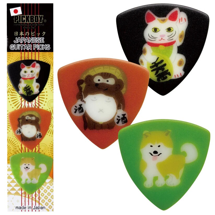 PICKBOYのおみやげギターピック3枚セット。日本の文化や風景が施されており、ポストカードのような見た目は日本土産としても最適です。