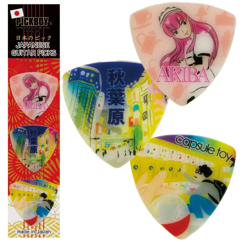 PICKBOYのおみやげギターピック3枚セット。日本の文化や風景が施されており、ポストカードのような見た目は日本土産としても最適です。