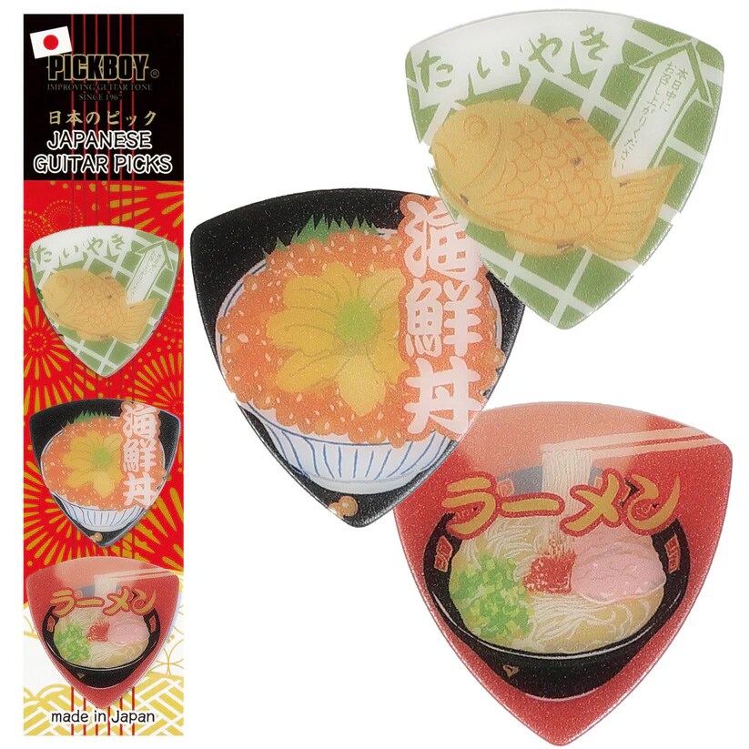 PICKBOYのおみやげギターピック3枚セット。日本の文化や風景が施されており、ポストカードのような見た目は日本土産としても最適です。