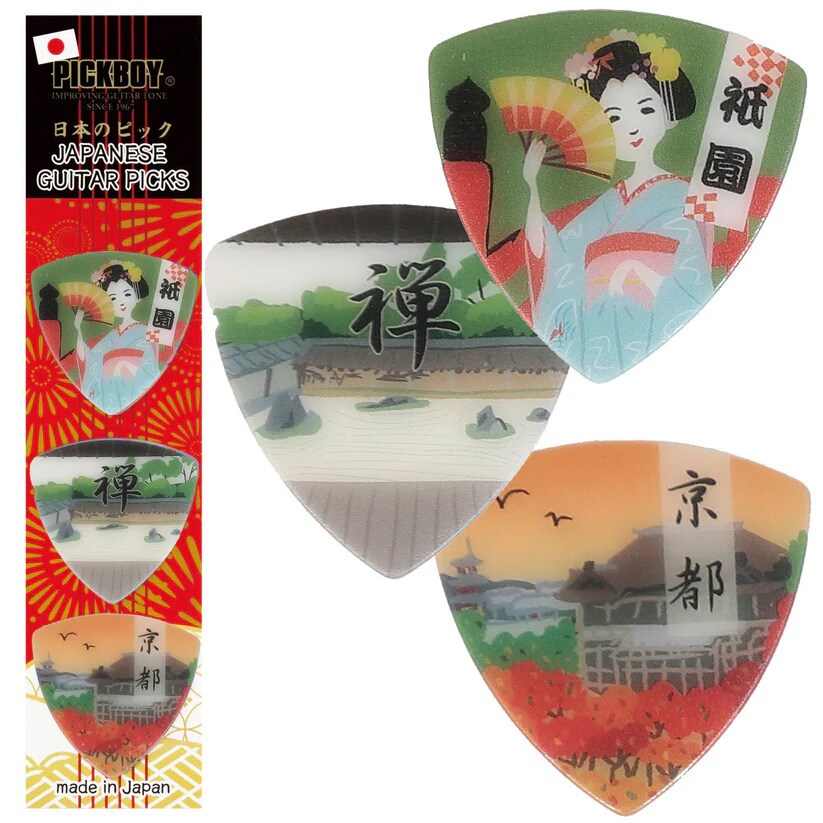 PICKBOYのおみやげギターピック3枚セット。日本の文化や風景が施されており、ポストカードのような見た目は日本土産としても最適です。