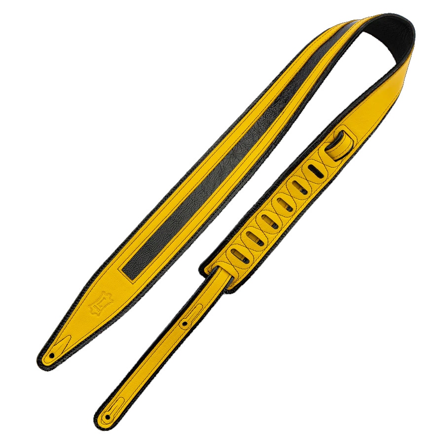 実際に手に取ると、ブラック部分がかなり光沢感のある柔らかいビニールレザーのようで惹かれる1本!イエロー部分とは素材違いで、とてもファッショナブルなストラップです。まさにアメリカのメトロポリスを感じます。気になる使用感はさすがLEVY'S。幅が約6.35cmと広めの仕様となっており、縫い目も丈夫で安定感は抜群!座奏でも立奏でも調整が効く長さも嬉しいですね。