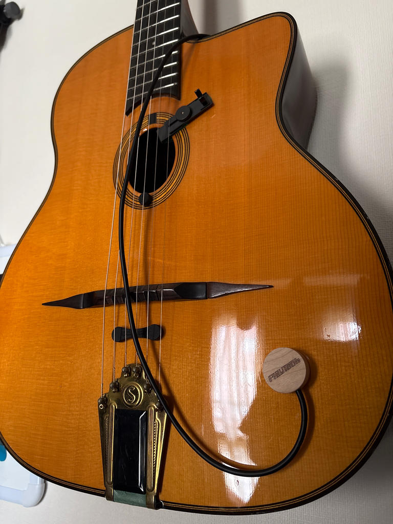 取り付けはとにかく簡単で、付属の粘着剤(ガムみたい)をピックアップにくっつけて楽器に張り付けるだけです!取り付ける位置によって音の雰囲気を変えることができるので自分だけのお気に入りを見つけてみるのもいいかもしれません。