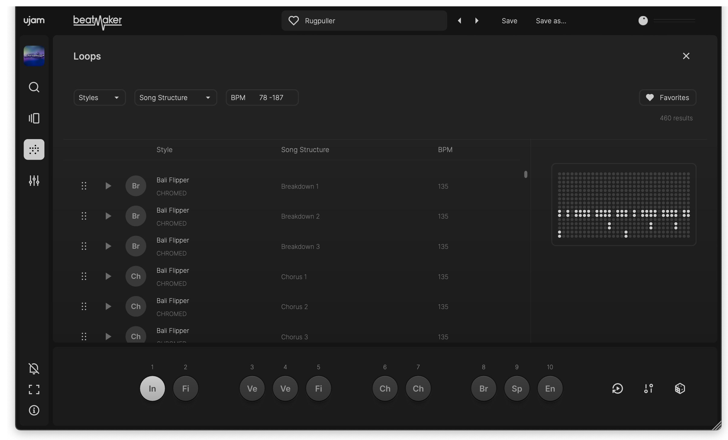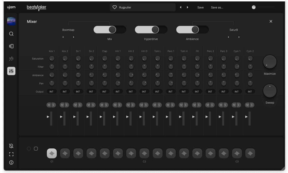 搭載されたインテリジェント・ブラウザでは、楽曲の雰囲気やジャンル、BPMなどのタグを使用することで思い描いたビートを素早く検索でき、未所有のBeatmaker音源もその場で試聴が可能です。各トラックを個別に調整できるミキシング・ページでは、ボリューム、パン、フィルター、アンビエンス、サチュレーション、出力ルーティングをプラグイン内でコントロールできます。