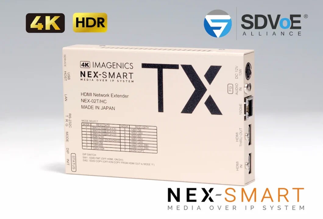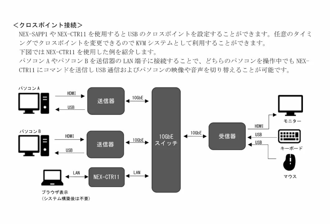 4K60/4:4:4 までのHDMI 信号をCAT6Aケーブルで最長100m 伝送することができる送信器。映像信号や音声信号の他に、USBと1000BASE-T までのLAN を伝送できるほか、NEX-SMART 用のコントローラーやアプリケーションおよび10GbE スイッチと組み合わせて使用することで、多分配構成、マトリックス、ビデオウォールを構築することができます。