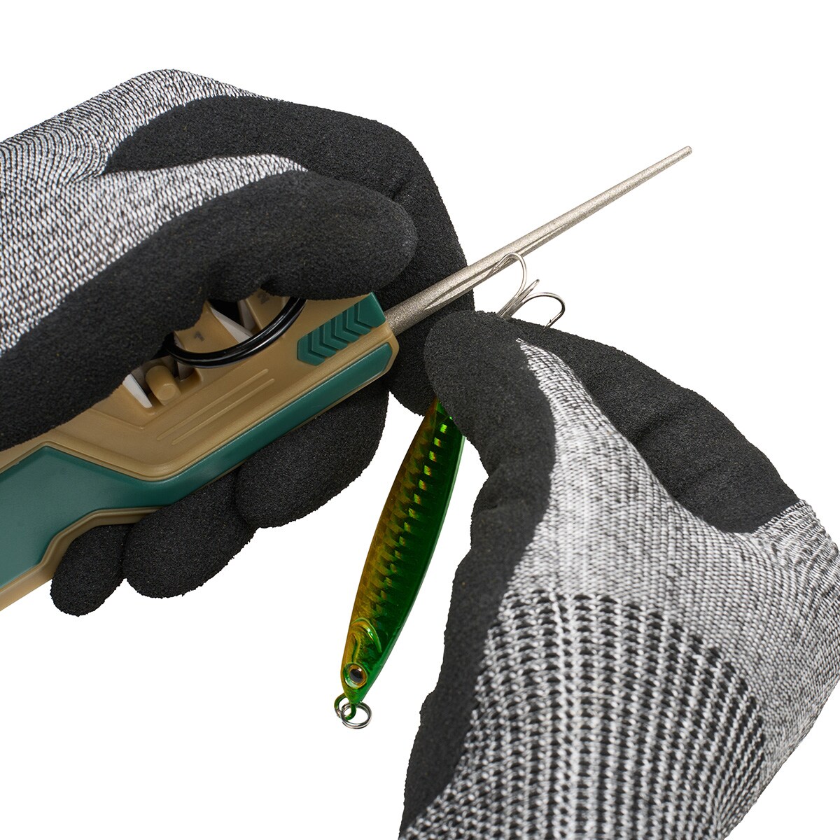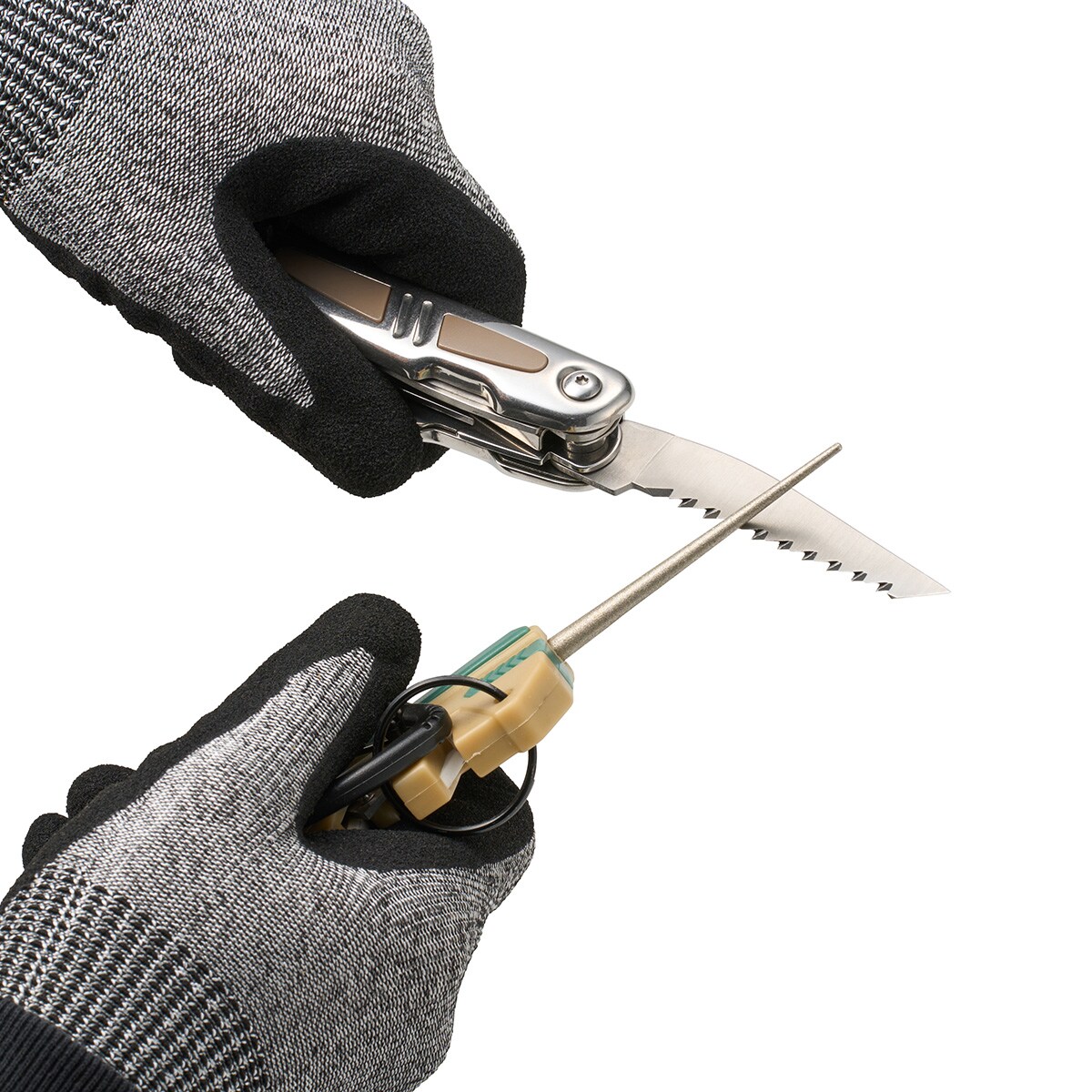 内蔵されたスティックシャープナーは、波刃や釣り針の研磨にも便利。さらに緊急時に役立つホイッスルも内蔵。