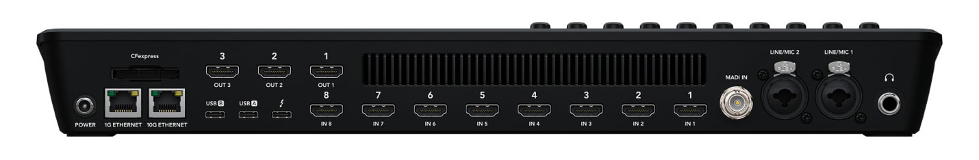 ハイエンドの放送スタジオ向けに作られた、パワフルかつコンパクトなライブスイッチャーです。拡張されたプロ仕様のコントロールパネルに、配信機能、フォーマット変換に対応した8つのHDMI入力、3つの独立したHDMI出力、配信エンジン、マルチビュー、収録/再生用のCFexpressおよびThunderboltを搭載しています。