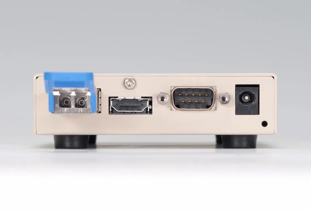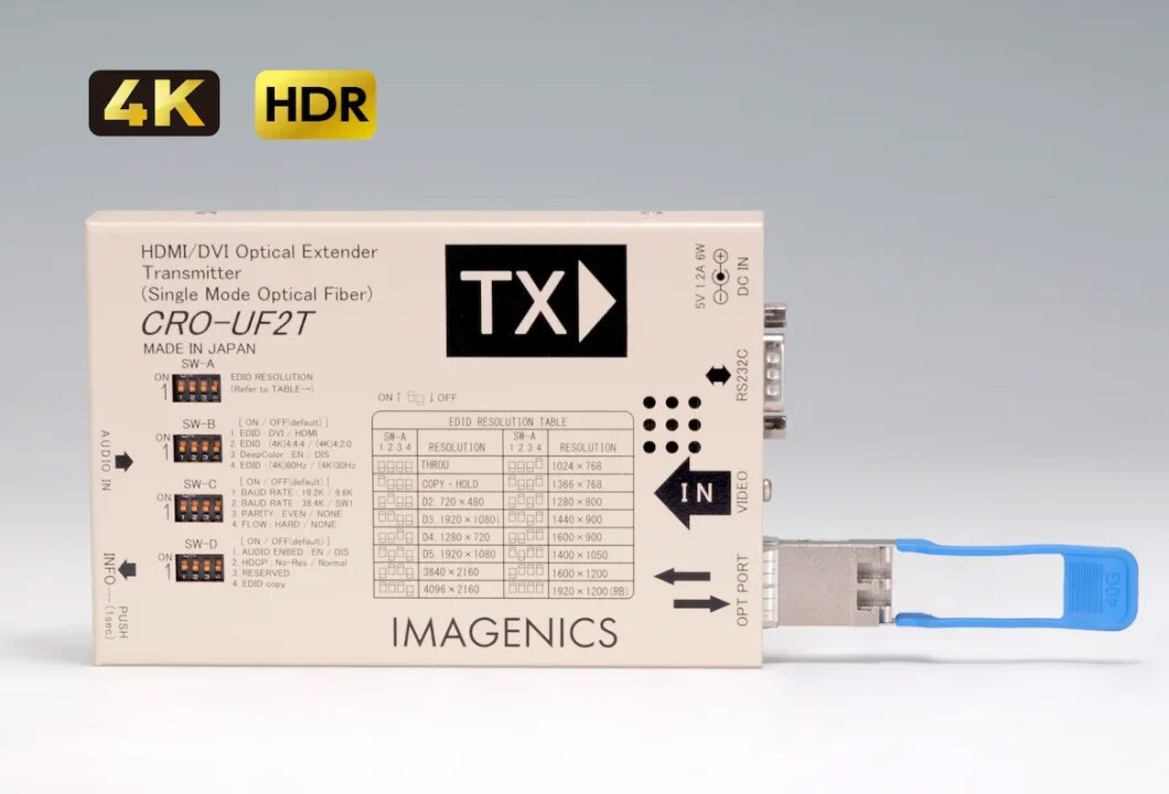 HDMI 2.0の4K@60Hz(4:4:4)の非圧縮映像をシングルモード光ファイバコード2本、もしくは1本で最大2km伝送する光延長器の送信器。