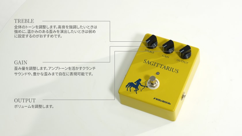 TREBLEノブの効きも良いので、歪みを控えめ(もしくは思い切ってGAINを0にするのもいいです)にすればトレブルブースター的な使い方にもばっちりです。バッキングを前に出したいときやシンプルにソロを演奏するときなどに、お気に入りの歪みをプッシュするようなイメージで使ったりするのもいいように思います。