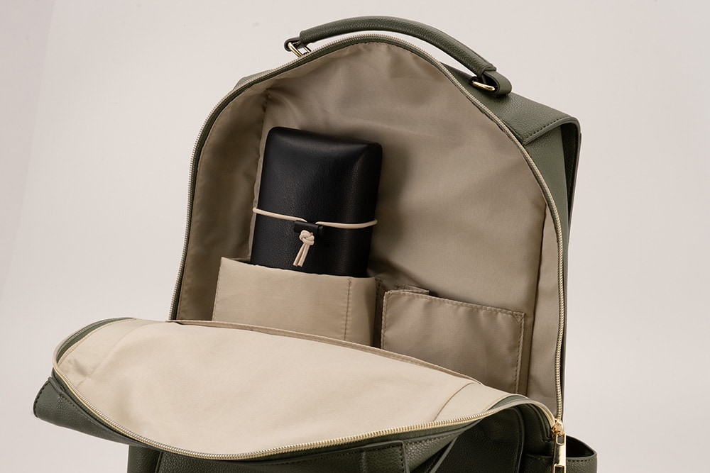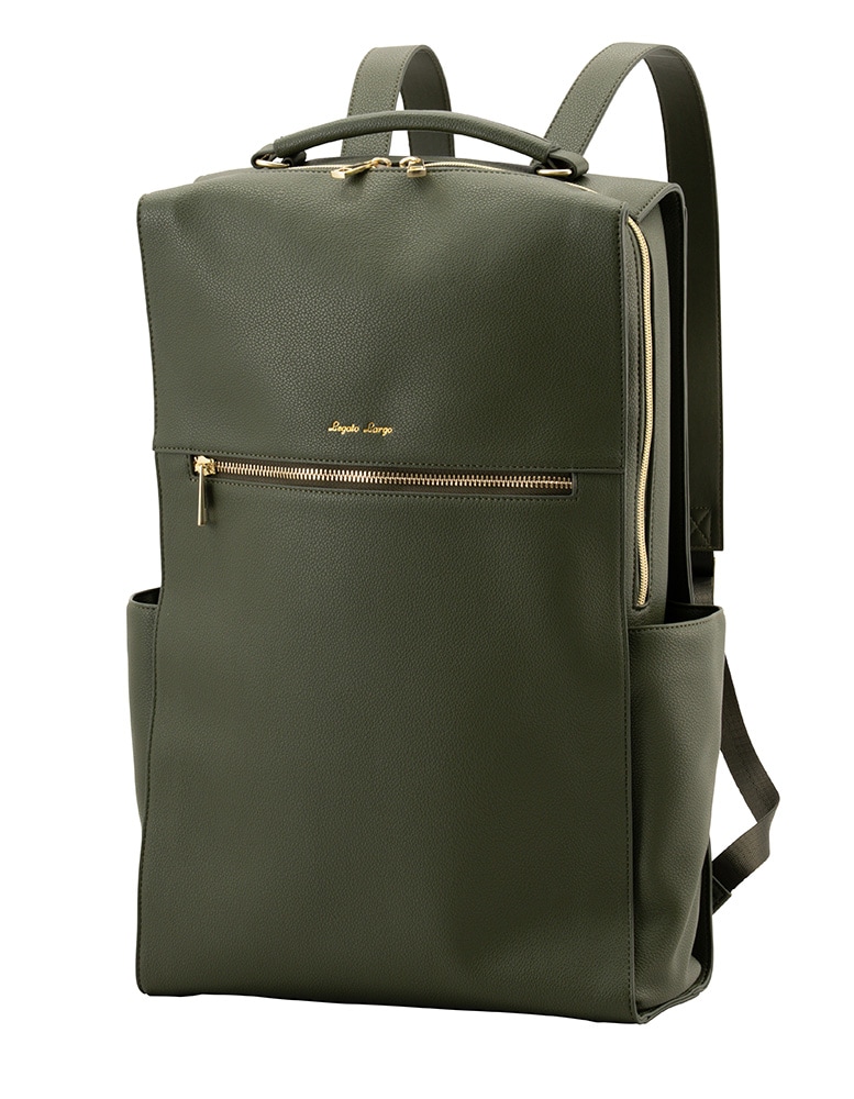 フロントにはファスナー付きポケットを備え、スマートフォンやハンカチなど、さっと取り出したい小物の収納に便利。
