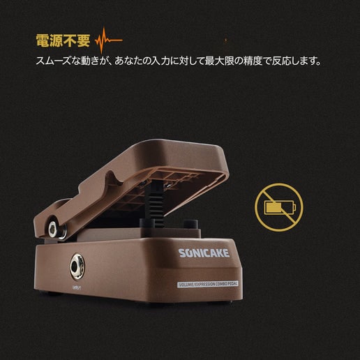 SONICAKE/Vexpressは、電源不要ながらボリュームとエクスプレッションの両機能を備え、接続先を自動で判断して機能を切り替える便利なエクスプレッションペダルです。