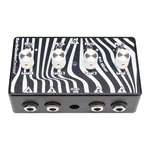 Phase: 出力される信号の位相の変換。ペダルや他の楽器の出力は必ずしも同じ位相で出力は設計されておりません。Four to One Mixer上で入力された信号をミックスした際に音が薄い等の問題が有りましたら、Phaseスイッチを使って位相を反転させてみてください。通常は“+”の設定で問題有りませんが、上記の様な音の変化が見られる場合は“-“側に設定して音の変化を確認してください。