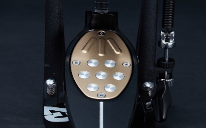 ゴールドがアクセントのトラクションプレートには、フットボード上の滑り止めとして機能する“トラクションドット”を装備。ドットの位置調整や取り外しが可能で、好みに合わせたグリップ感を設定できます。さらに、プレートには3本のガイドラインがあり、上下逆にセットすることでスライド感のニュアンスも変化。靴、靴下、裸足など、奏者のスタイルに応じた最適なフィーリングを追求できます。