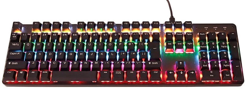 PGK100は圧倒的なコストパフォーマンスながら、ゲーミングキーボードとして十分なスペックを持っていると思います。底面のラバーによりしっかりと止まってくれるため、安価なプラスチック製キーボードにありがちな「打鍵時のズレ」がなく安定感があります。キースイッチには万人受けする赤軸を搭載しており、すっと沈み込む軽やかな打鍵感です。日頃のお仕事や、まさに今このレビューもPGK100を使っていますが、 押し込みがスムーズなので、長時間のタイピングでも指が疲れにくいのがGOODです。FN+INSキーで点灯モード切替が可能で、17種のモードを順番で切り替えられます。私はギラギラ光るよりも優しく光ってくれるモードが好きなので、じんわり光らせています。