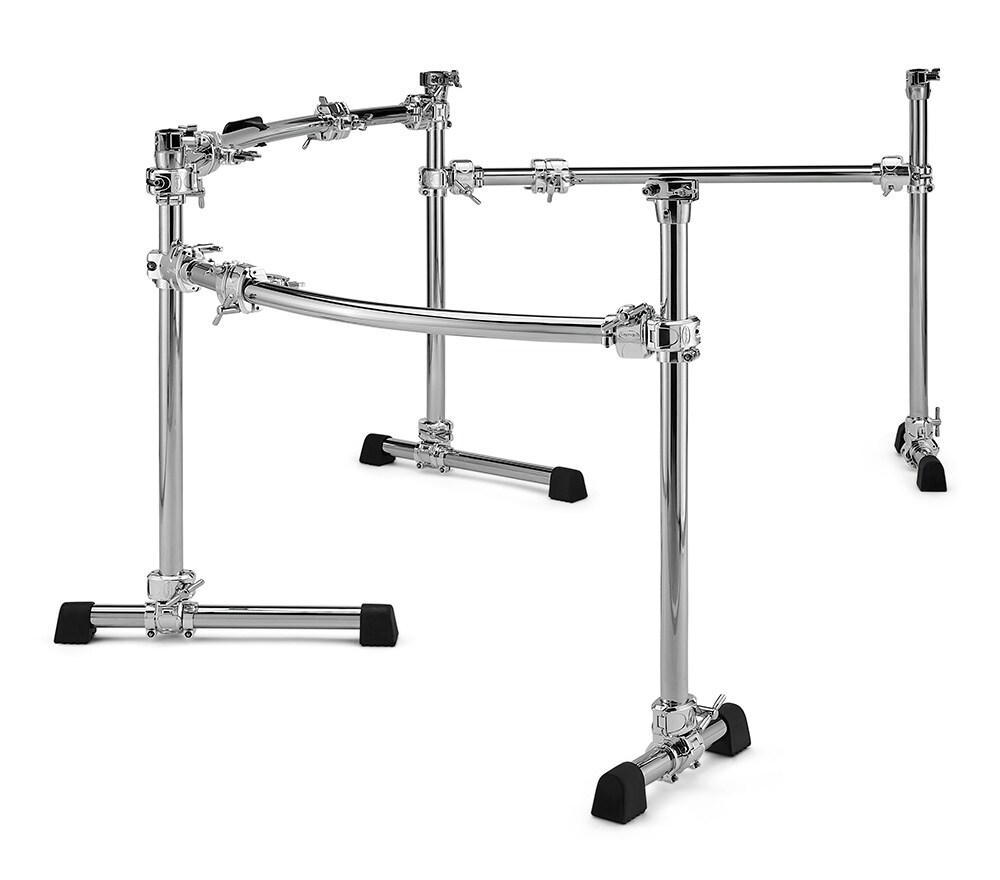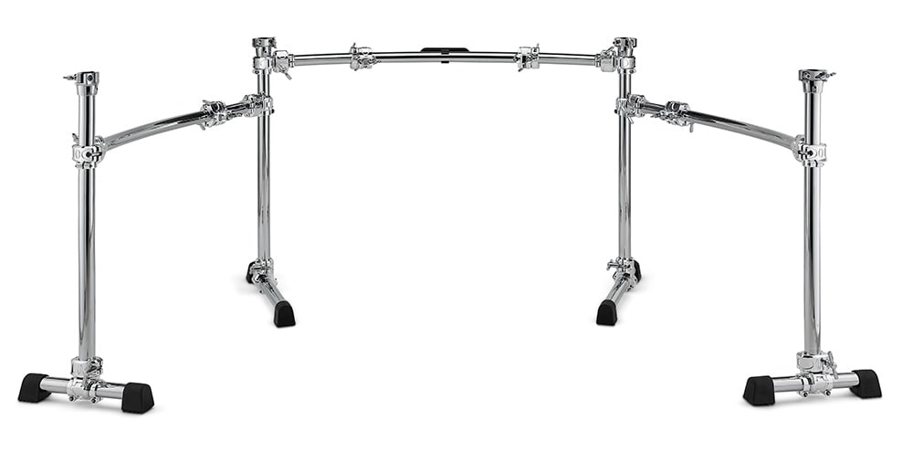 大規模なドラムセットにも対応できるよう設計された、パワフルかつスマートなラックシステムです。2?3個のラックタムに加え、複数のシンバル、電子パッド、各種アクセサリー類を一括してマウントでき、広範なセッティングをコンパクトな設置面積で実現します。標準構成で、クロスバーに4か所のマウントポイント、各レッグ内部に1つずつ、計4か所のシンバルマウントを装備。従来のシンバルスタンドを一切使わず、床面をすっきりと保ちながら、自由なレイアウトが可能です。