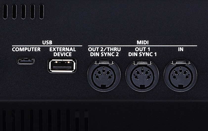 TR-1000はマルチチャンネルUSB-Cオーディオ・MIDIインターフェースとして機能し、お好みのコンピューターと接続可能です。USBデバイス・ポートでは、システム・バックアップ/リストア、WAVオーディオのインポート/エクスポートのためのフラッシュ・ドライブ接続に加え、Roland A-49やA-PROシリーズなどのUSB MIDIコントローラーをサポート。これらの包括的なMIDI入出力に加え、MIDI以前のシンセやリズム・マシンと同期するためのDINシンクも装備します。