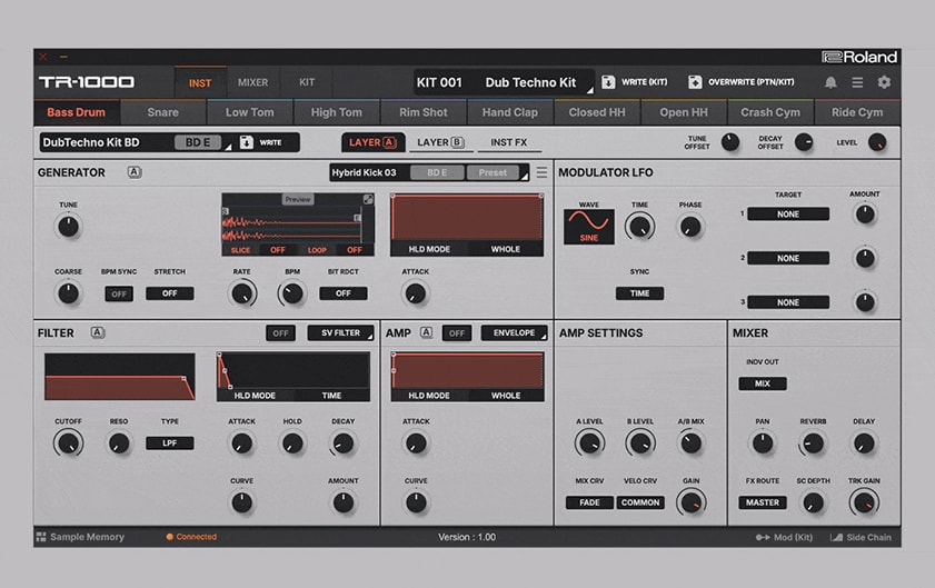 TR-1000は、スタンダードなサウンドからエクスペリメンタルなものまで、あらゆるドラム・サウンドを網羅します。アナログ、デジタル、サンプリングによる高品位な音源と進化した音作り、レイヤー・トラック構造によって、音色の着想から創造、そしてパフォーマンスまで、いつまでも惹きつけてやみません。