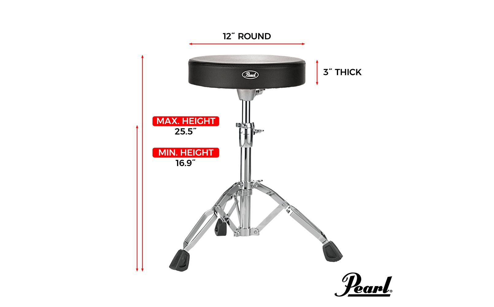 硬めでラウンド形状の合皮(PVC)製シートに、グリップ力を高めたラバーチップとシート落下を防ぐリングストッパー付きの脚部を装備。高い安定性と信頼性を備え、ダブルレッグ構造によりヘビーなプレイも安心です。