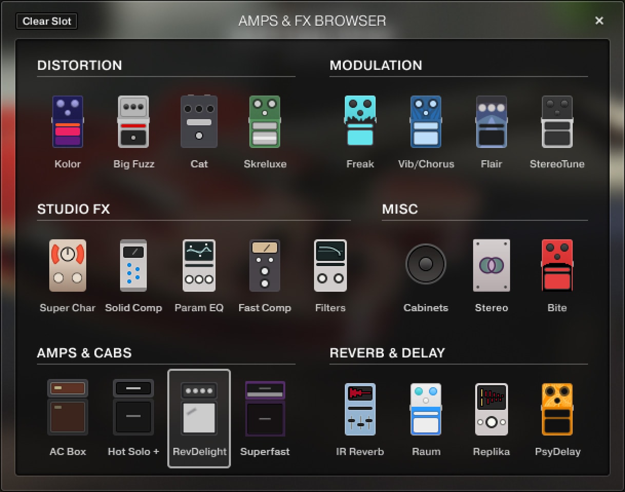 ・DI/マイク信号、アンプ、キャビネット、Guitar Rig 7 Proのスタジオエフェクトを含む47種類の柔軟なサウンドプリセット