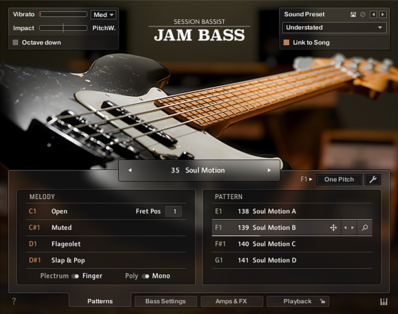 Jam Bassには、あらかじめ作成されたパターン用のパッチと、自分でメロディやソロを演奏するためのパッチが収録されており、2つの方法で演奏が可能です。これらを組み合わせることで、あらゆるジャンルで本格的で表現力豊かなベースパートを簡単に作成でき、さまざまなアーティキュレーションやテクニック、演奏スタイルでアイデアを形にすることができます。