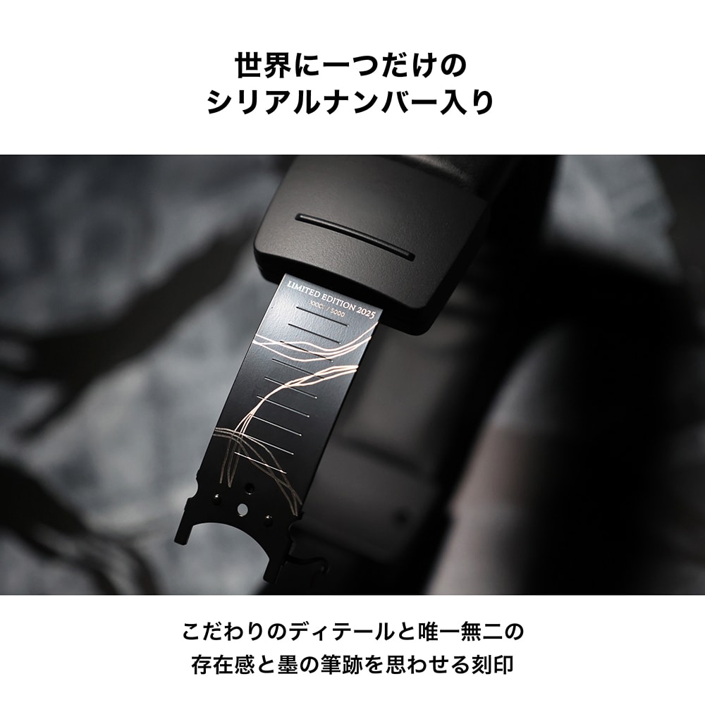 ・ヘッドバンドのスライダーとリング部分には、墨絵の筆跡と音の波形をモチーフにした特別な刻印を施しました。