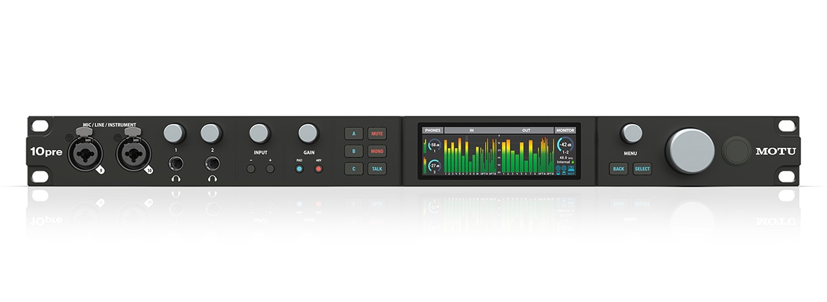 10preは、MOTUが誇る透明感の高いプリアンプを10系統搭載し、各チャンネルに個別のゲイン、PAD、48V、位相反転を装備。マイク入力1-2には外部機器用インサート端子も備え、柔軟なシグナルフローを構築可能です。モニターグループ機能による5.1ch/7.1ch制御にも対応し、3.9インチ高解像度TFTディスプレイで全入出力を直感的にモニタリング。複数のMOTUデバイスや旧AVBシリーズとの接続により、最大256チャンネルI/Oの拡張も可能です。