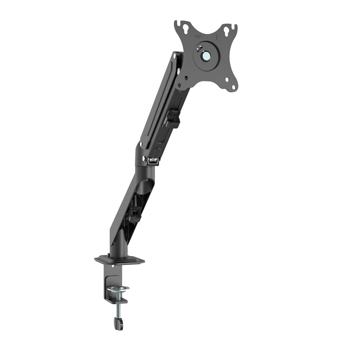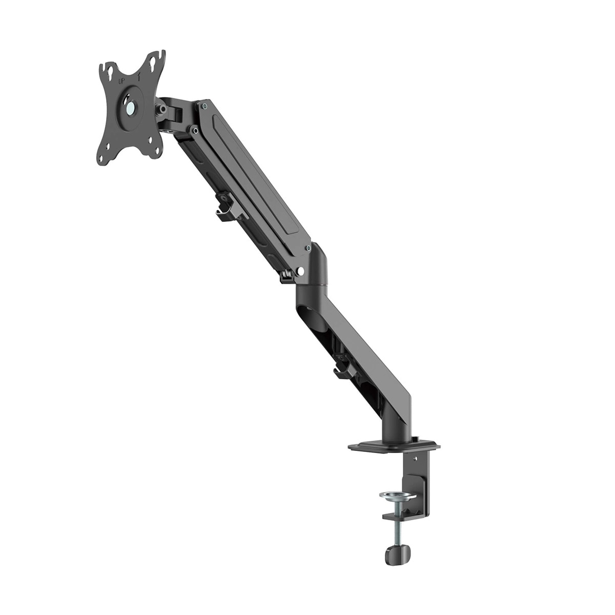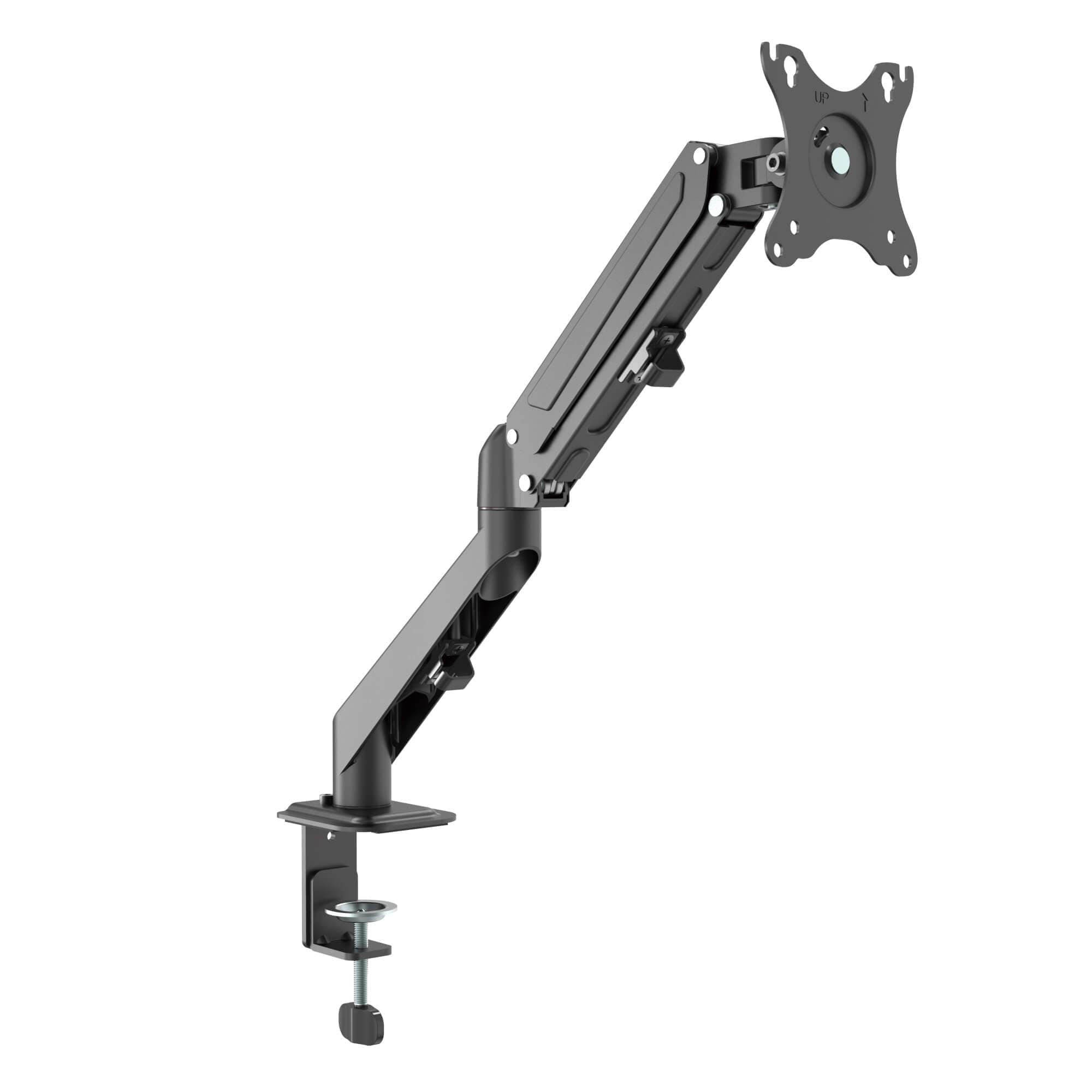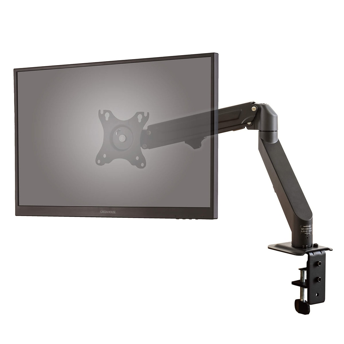 ガススプリング式で軽い力で自在に動かせるモニターアーム「GH-AMCS01A」。4軸タイプで画面を前後にも動かせ、対応サイズは17~27インチ、耐荷重2~6.5kg。クランプ固定方式で設置もお手軽です。