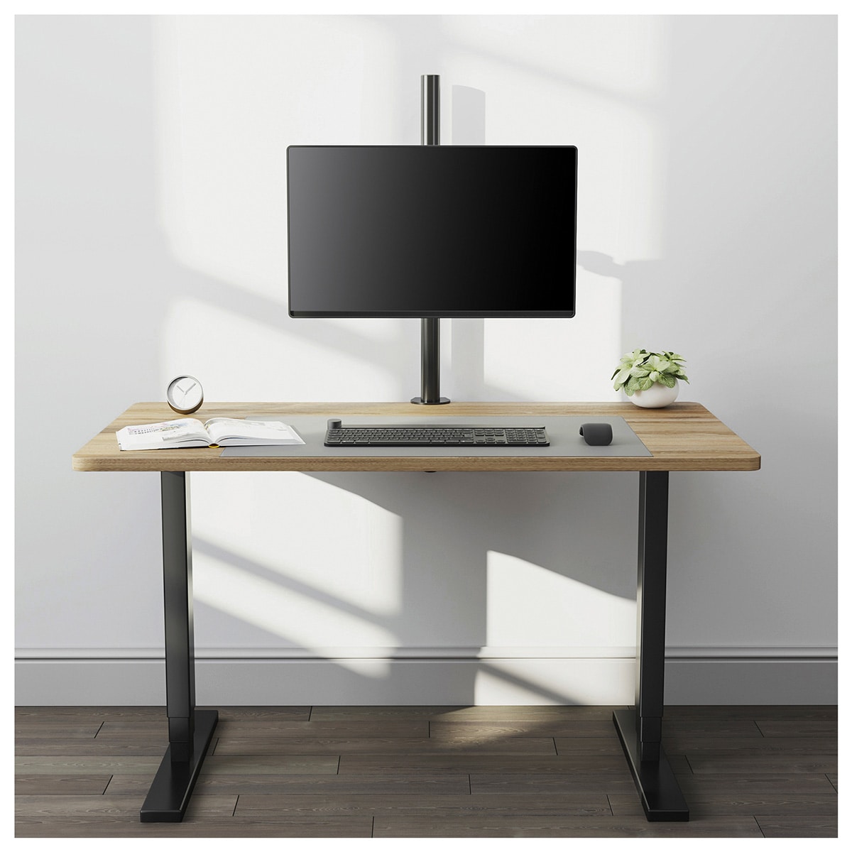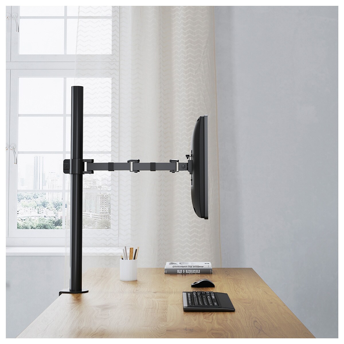 ロングポール仕様&4軸可動タイプの1画面用ディスプレイアーム「GH-AMEL1」。“高さ805mm”の支柱で、下にノートPCを置くスペースを確保しつつ快適配置。アーム長404mmで画面位置調整も幅広く、17~32インチのモニター対応。耐荷重最大8kg。VESA75/100規格対応で、1台ディスプレイを使い込むオフィスや在宅環境にも最適です。