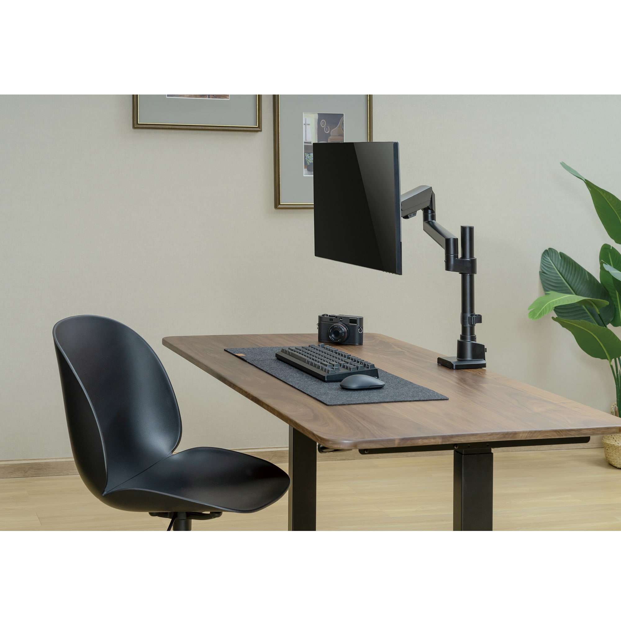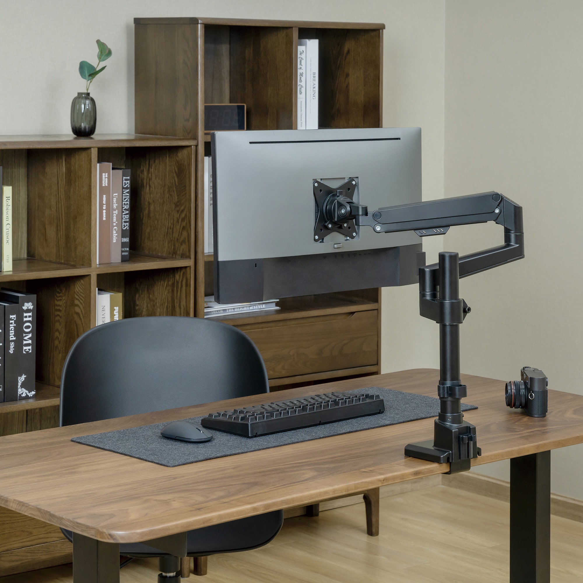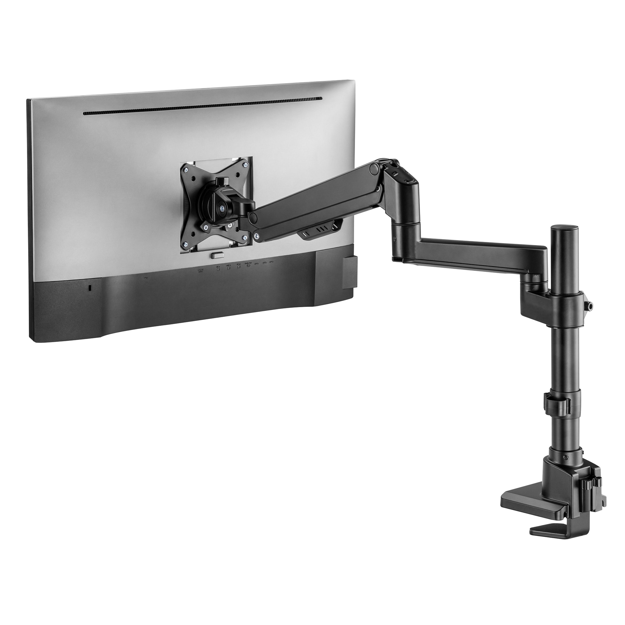 ガススプリング式のディスプレイモニターアーム「GH-AMEP1」。クランプ/グロメット両対応のC型設置、4軸タイプで画面の前後移動や縦位置設置も可能です。対応サイズは17~32インチ、耐荷重1~9kg。取り付け工具も収納可能、ケーブルもスッキリまとめられるガイド付きです。