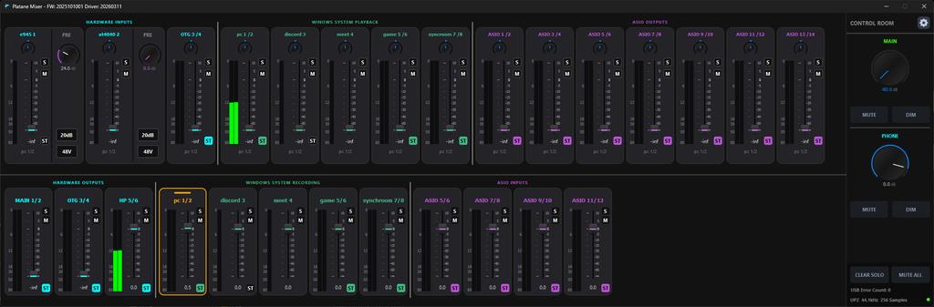 ソフトウェアミキサーの動作がよくわからない箇所がある。例えば、ブラウザでYouTubeを再生すると「WINDOWS SYSTEM PLAYBACK」の「PL1 1/2」のメーターが動き、ミュートボタンで音を消すことはできるが、フェーダーを操作しても音量は変わらない。