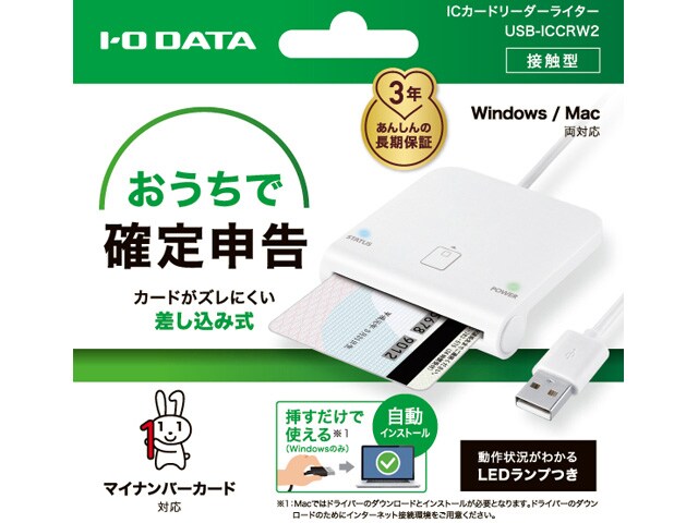 PCにUSB接続するだけで、マイナンバーカードや医師資格証などの接触型ICカードを読み取れるICカードリーダーライター。Windows11/10、macOSに対応し、USBバスパワーで動作。通信速度最大826kbps、準拠規格はISO7816・拡張APDU対応。外形66×66×16mm・質量約48g。初めての確定申告や行政手続きにも使いやすいモデルです。